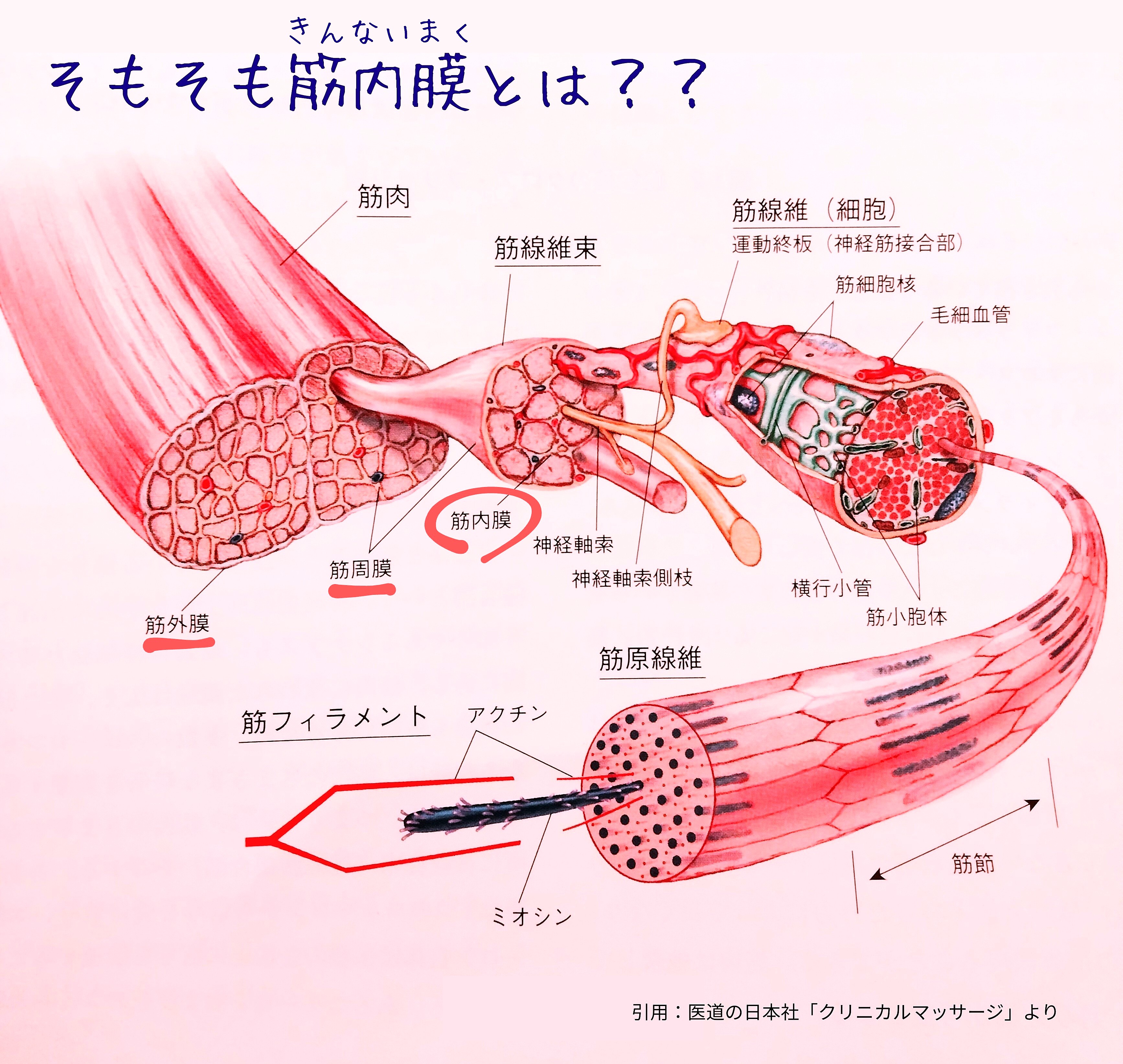 最も細かな単位の筋膜を筋内膜(きんないまく)といいます。